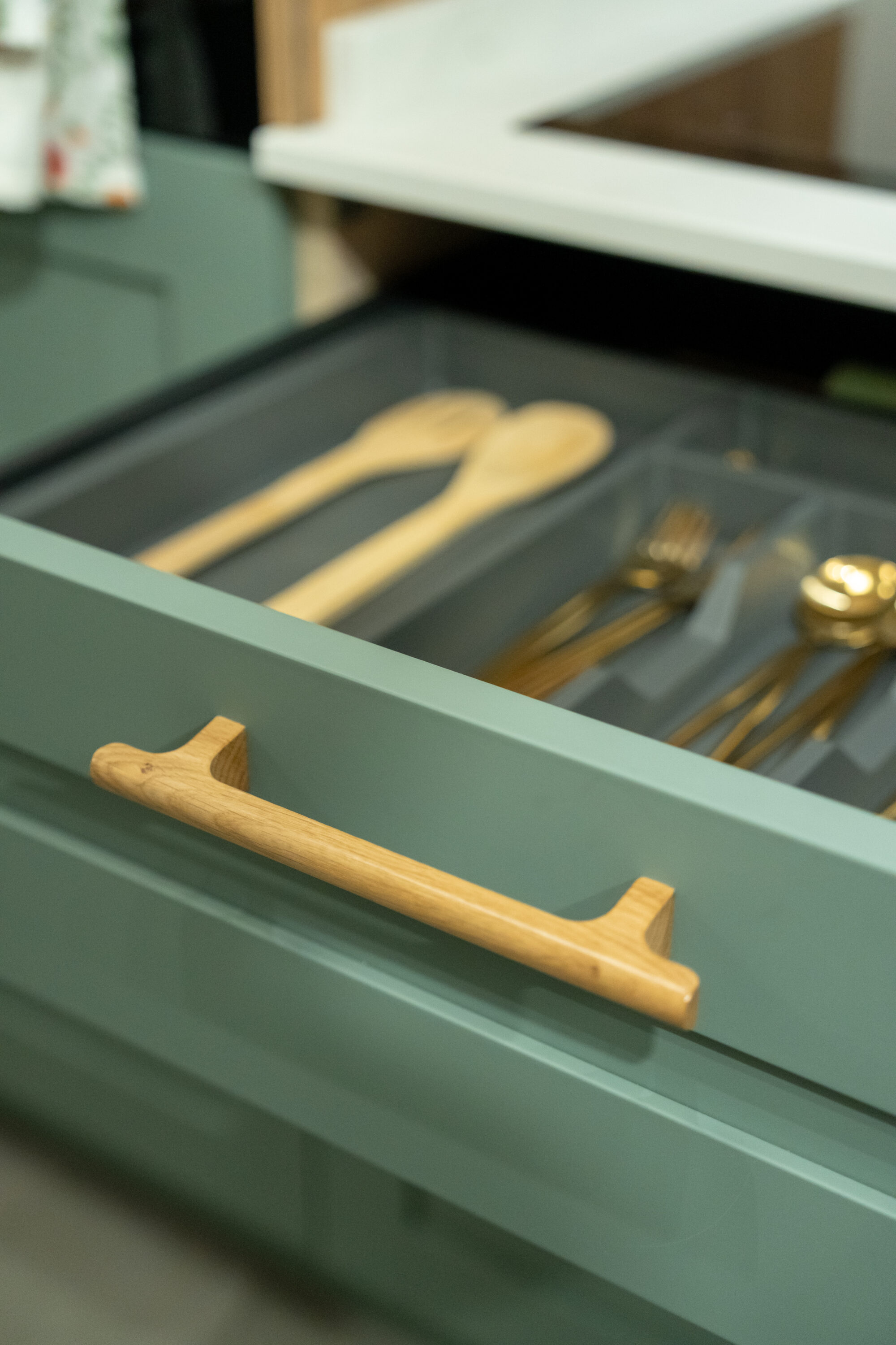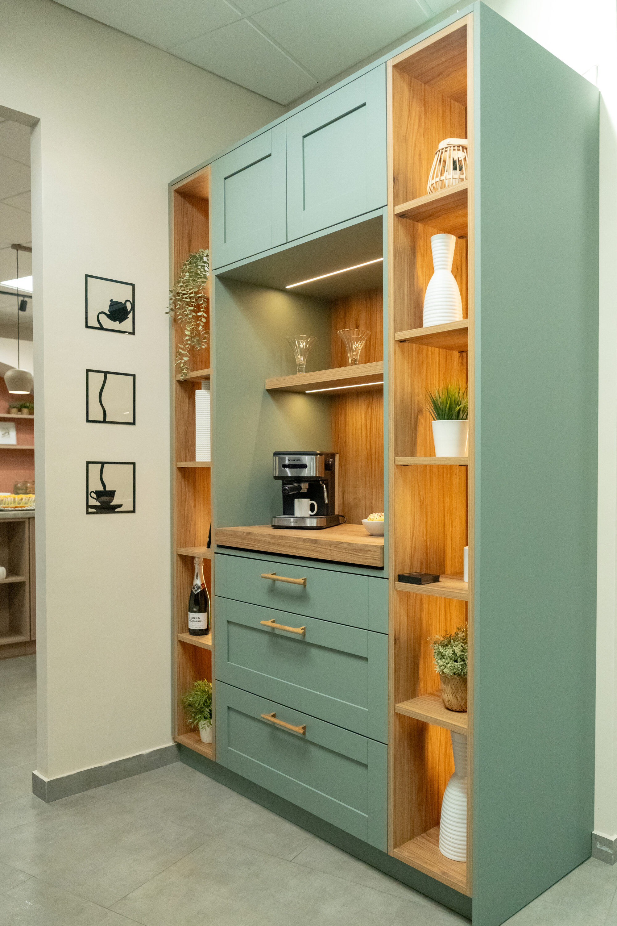 La composición se realiza con puertas modelo Irati en acabado Verde Suave, combinadas con madera de la Colección Universo acabado REA 043 Dinder Samari y tiradores ref. 0681 en acabado roble, generando un conjunto cálido y contemporáneo.