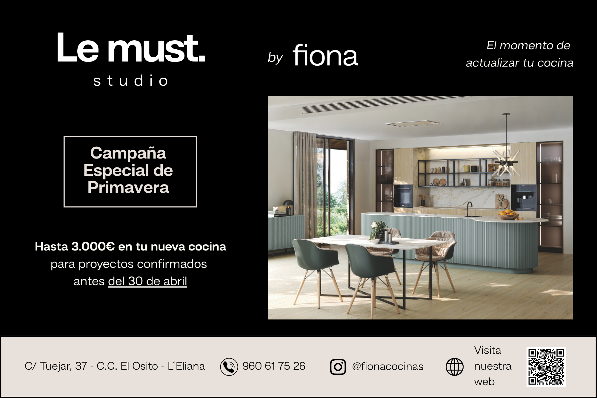 Solo hasta el 30 de abril, disfruta de condiciones especiales en proyectos de Cocinas Fiona: descuentos exclusivos en mobiliario a medida, diseño e instalación y ventajas en electrodomésticos y encimeras.